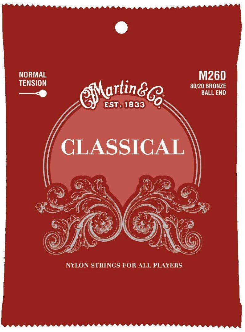 Martin M260 Ball End Regular Tension Classic Guitar Strings strings are made with a unique 80/20 composition alloy to give brilliance, clarity, and longevity of sound. The bronze winding alloy is ideally suited for making strings that have deep, rich basses and clear, bright trebles.