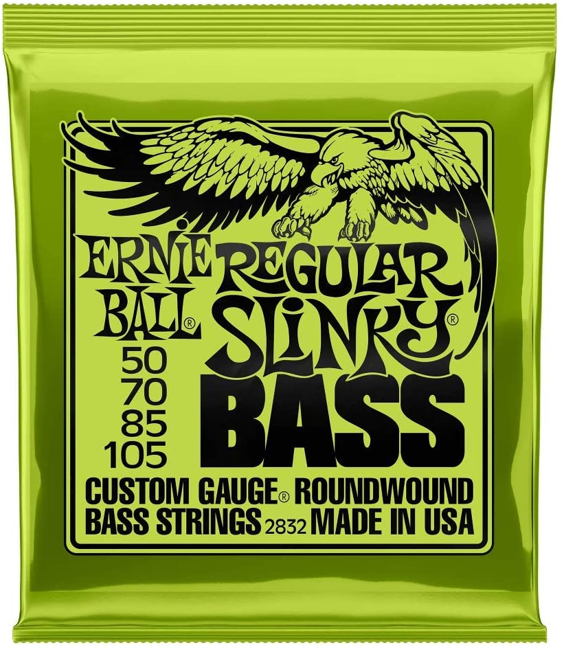 Ernie Ball regular slinky 4 string bass strings ; Gauges .050, .070, .085, .105. Part number 2832.